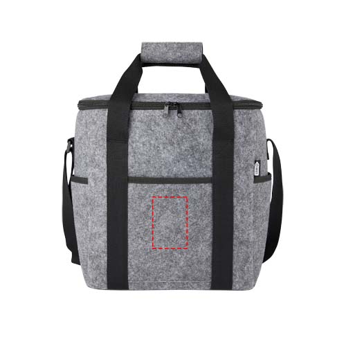 Grote koeltas van hoogwaardig zacht en duurzaam GRS-gecertificeerd gerecycled vilt. Beschikt over een groot hoofdvak (zes flessen van 1,5 liter) bekleed met voedselveilige en extra dikke thermische PEVA-isolatie met hoge dichtheid die dranken en versnaperingen urenlang koud houdt. Ritssluiting boven, voorvak en twee zijvakken voor extra opbergruimte. Verstelbare lange geweven schouderbanden van katoen (55 x 3,8 cm) en 2 geweven handgrepen van katoen (25 x 3,8 cm) met klittenbandsluiting bovenaan. Gemakkelijk schoon te maken. Capaciteit: 21 liter.